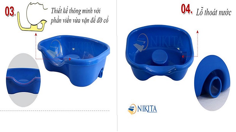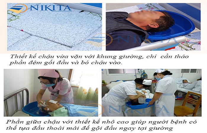 • Chậu gội đầu được thiết kế ngay tại giường, chỉ cần tháo phần gối đầu và để chậu vào là người nhà có thể gội đầu, vệ sinh cho bệnh nhân ngay tại giường.