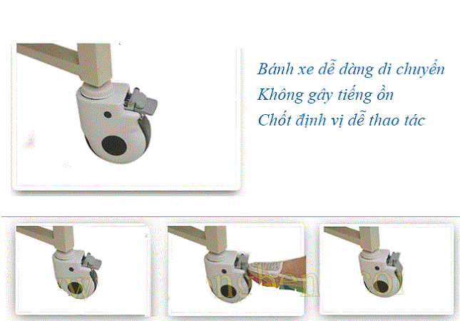 - Giường bệnh sử dụng bánh xe nhựa chịu lực, lõi bằng thép không gỉ, thiết kế 4 bánh xe có phanh, giúp giường trở nên cơ động khi cần di chuyển; khi hãm phanh giường sẽ cố định lại rất chắc chắn.