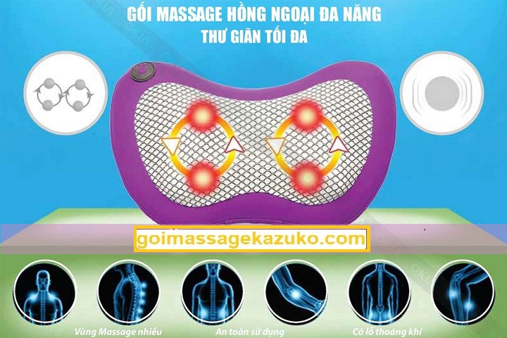 – Máy massage Kazuko hồng ngoại 8 bi đa năng làm giảm đau nhức mỏi nhiều vị trí của cơ thể như: vai, cổ, gáy, lưng và bắp chân hiệu quả. Gối còn có thể dùng trên ghế văn phòng, dùng dược cả ghế ô tô.