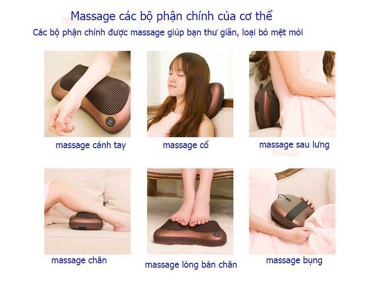 • Gối massage giúp vùng vai, cổ, gáy, đùi, lưng .. giảm đau nhức, giảm sự căng cơ.