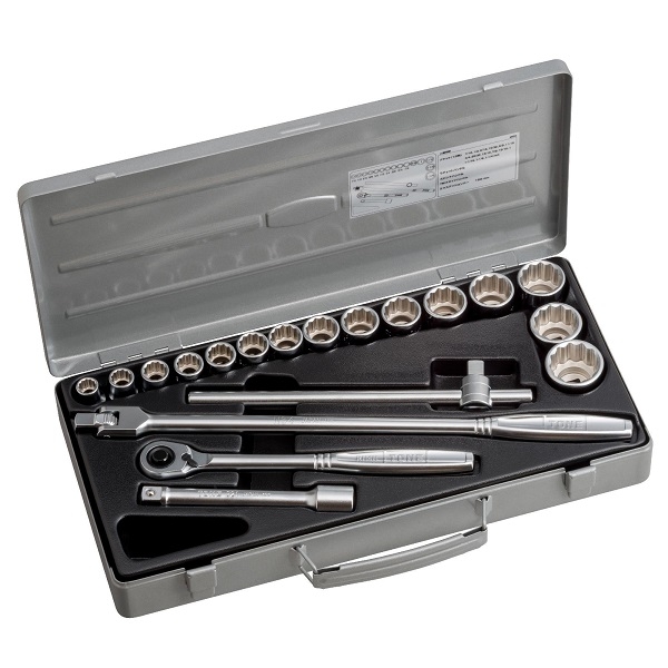 - Hộp đầu khẩu và cần văn gồm 19 chi tiết hệ 1/2 inch.