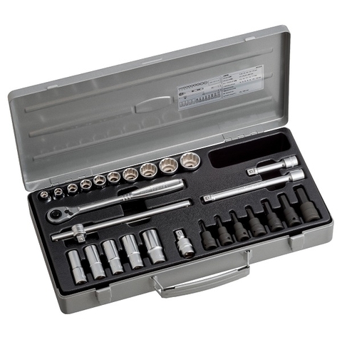 - Hộp đầu khẩu và cần văn gồm 27 chi tiết hệ 3/8 inch.