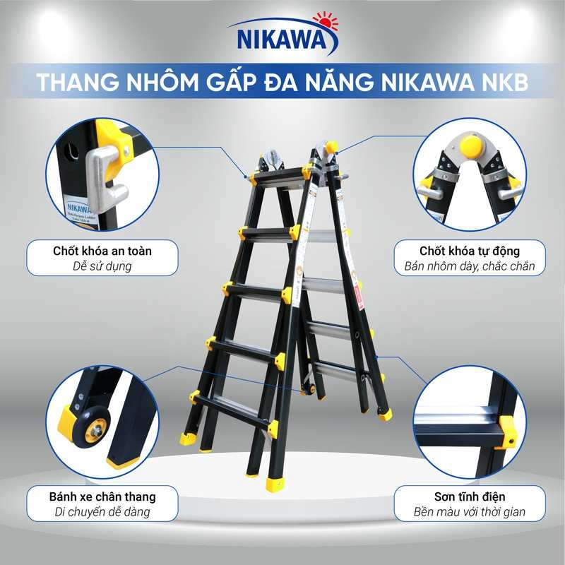 - Thang nhôm gấp đa năng Nikawa NKB-44 là loại thang cùng mẫu với thang nhôm NKB-43 nhưng độ rộng chân thang lớn hơn và trọng lượng lớn hơn.