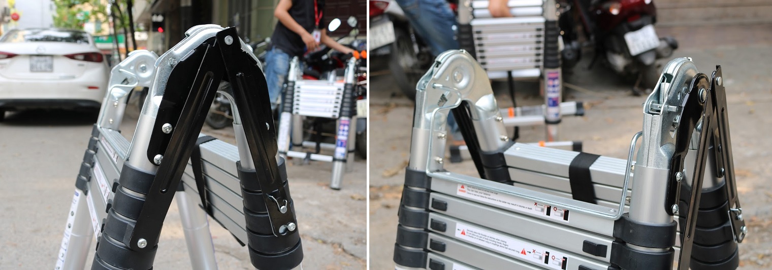 – Thang rút chữ a Ameca ở giữa 2 đầu nối thang được gia cố thêm bằng kẹp sắt giúp thang thêm kiên cố và an toàn khi dựa thẳng. Thiết kế linh hoạt và thông minh, có thể sử dụng thang theo chữ A hoặc chữ I tùy ý.