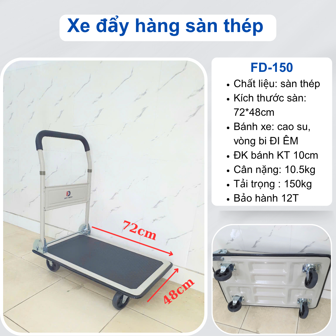 - Sàn xe đẩy hàng 4 bánh FD-150 làm bằng chất liệu thép, độ dày đạt tiêu chuẩn giúp tải trọng lên đến 150kg chắc chắn sẽ là một trợ thủ đắc lực để hỗ trợ khách hàng trong việc vận chuyển hàng hoá một cách hiệu quả nhất và cũng tiết kiệm không gian nhất.