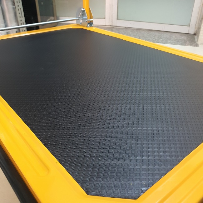 - Xe đẩy hàng T300 có bề mặt sàn thiết kế vân sần chống trơn trượt, đảm bảo an toàn cho hàng hóa khi vận chuyển.