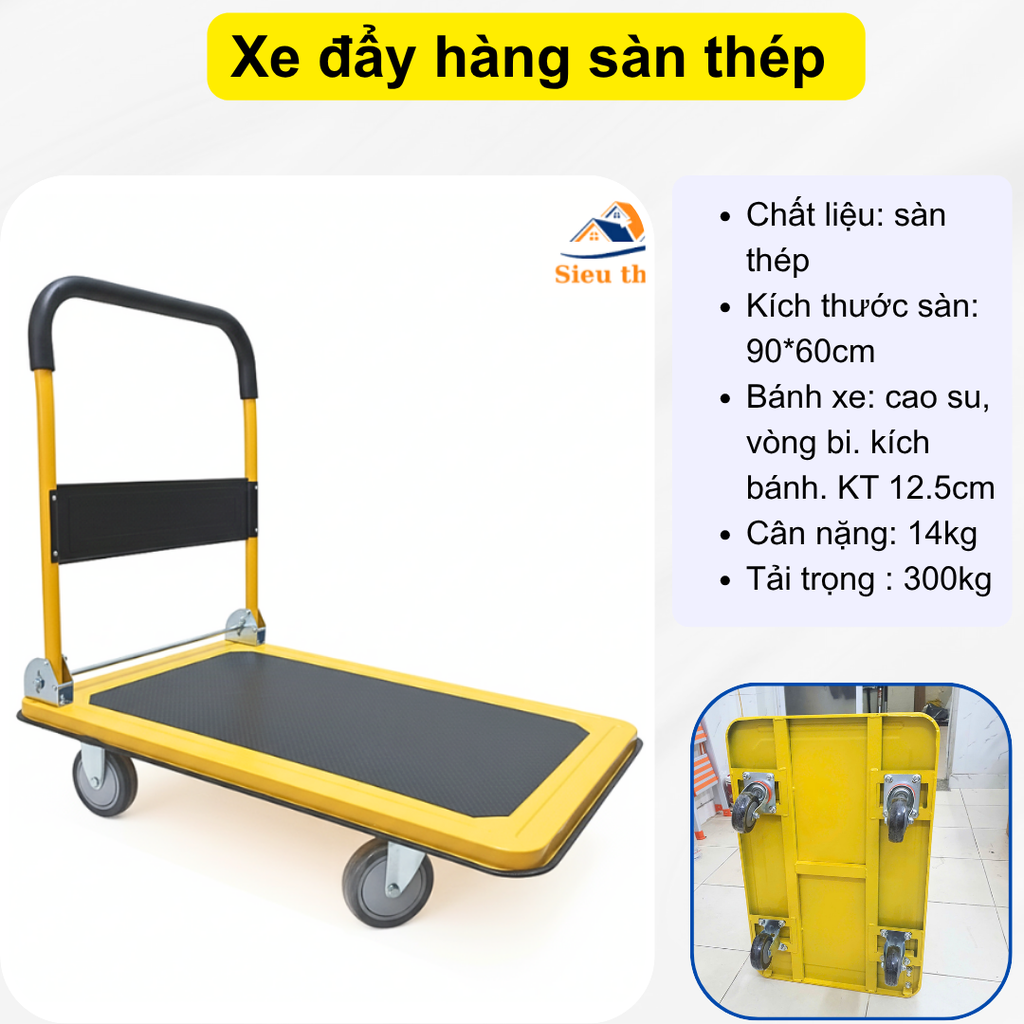 Đánh giá Xe đẩy hàng sàn thép 4 bánh vàng đen 300kg