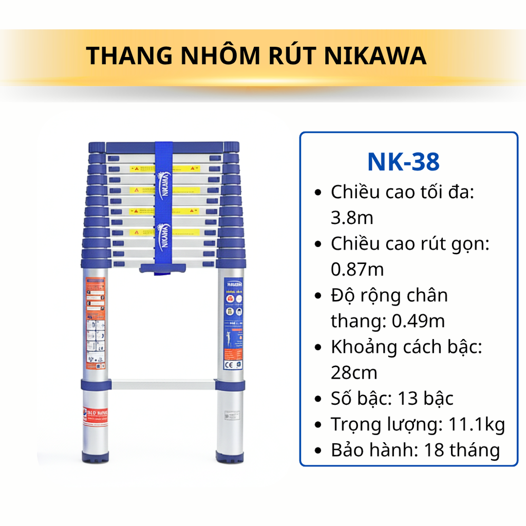 Thang nhôm rút NK-38 NEW có thể sử dụng ở các chiều cao từ 0,87m cho đến 3,8m.